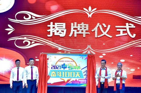 会议伊始,林子平委员、赵云清局长和欧阳祝棣校长、颜良江副校长为“中考倒计时牌”揭幕。伴随激昂的背景音乐,红色幕布徐徐拉开,在场师生和家长代表共同见证了这庄严而激动的一幕!随后,年级主任、教师代表、学生代表、家长代表、欧阳校长以及领导分别上台发言致辞。