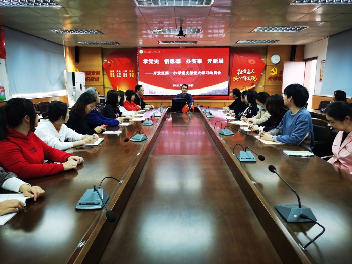 3月19日下午,开发区第一小学党支部召开党史学习教育动员会,党支部书记、校长蔡长青同志作有关精神传达并讲话。全体教职工参加会议。