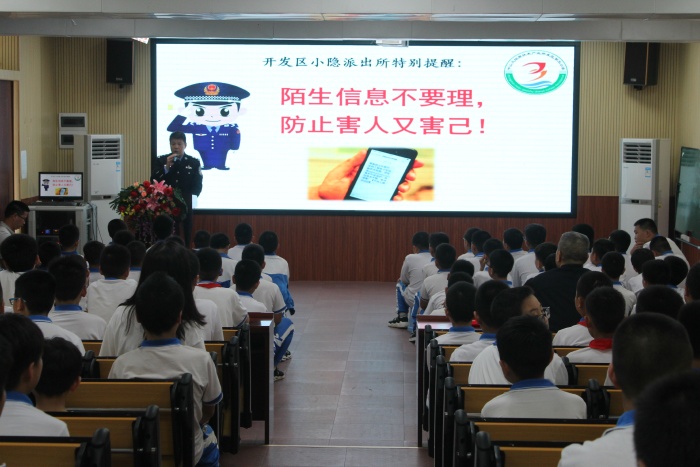 活动开始以胡冬梅校长为小隐派出所余冬茂副所长、黄伟权警员分别颁发“法制副校长”、“校园民警”聘书拉开序幕。法制副校长余冬茂所长为学生进行安全教育的主题讲座,余所长分别从信息诈骗、毒品犯罪、防性侵、校园欺凌以及什么是犯罪、如何防范等方面对学生进行了专门讲解。余所长用一个个鲜活的事例,提醒学生一定要提高警惕,学会自我保护,不要轻信陌生人,不吃陌生人的饮料和食品。内衣所及之处都隐私部位,任何人提出对这些部位的身体接触,都要断然拒绝;对于陌生人或熟人自己认为不舒服的其他部位的身体接触,要勇敢地说“不”。关于校园欺凌要人要做到不他人,也要防人欺,同学之间友好相处、文明相处。