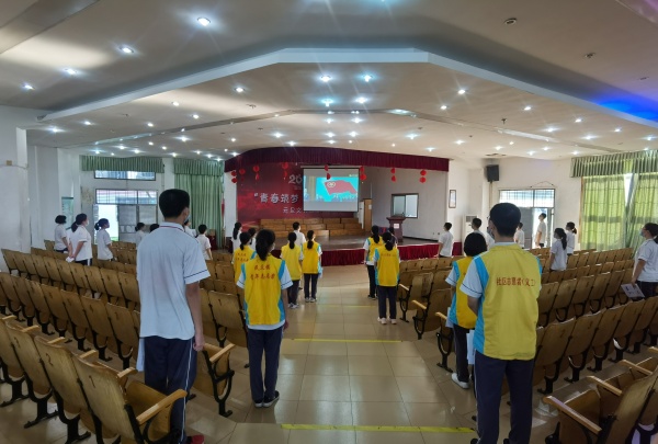 第二批参加人员为初三级新老团员。当天下午5:00,在学校团委副书记陈比比老师的带领下,团支书们身着志愿者服组织新老团员在阶梯礼堂按疫情防控要求隔开2米