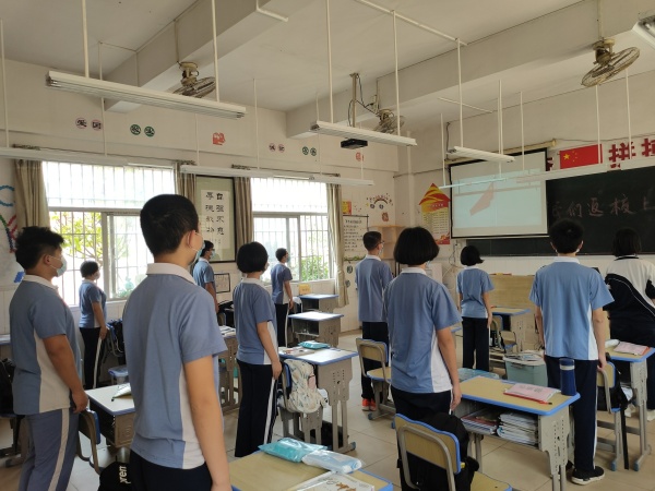 在校门口,有乘坐校车学生及骑自行车的走读生错峰陆续抵达校门口,学生们都能自觉佩戴口罩,保持一米以上的距离有序排队,依次进入体温监测区域,没有出现聚集的现象。进入校园后,学生们通过教室专用通道进入教室后,整齐地坐在教室内进行复学第一课的学习。”复学第一课“由中山市第一中学任山鹏老师担任主讲。以“天使归来,英雄开讲”为主题,邀请中山市第四批援鄂医疗队队长、中山市人民医院ECMO研究室副主任廖小卒;中山市第二批援鄂医疗队成员、中山市中医院呼吸科医师傅进艺等医护人员,现场讲述中山医疗队驰援湖北的惊心动魄的经历。通过中山援鄂抗疫英雄的亲身讲述,班主任带领学生回顾医护人员及全国人民与新型冠状病毒艰苦斗争的历程,从中理解英雄的含义,培养学生崇敬英雄、学习英雄、捍卫英雄、关爱英雄的情感,进而感悟国家的强大、人民的团结。同时,通过介绍医护人员精湛的医术,引导学生明白刻苦学习是奉献社会的重要基础,从而增强学生的社会责任感。”复学第一课“结束后,学校还组织初三学生进行了防疫实操演练,包括洗手、用餐等。此外,在复学的第一天,每一位返校的初三学子都收到了一个特殊而又温暖的礼物——健康包,这是由中山市民众镇政府赠送给学生的,希望它能给同学们带来平安与健康。