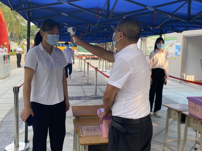上午10点整,演练正式开始。一群由班主任扮演学生通过测温区进入校园,经测体温有体温异常,学校保健员老师进行第二次测温,核查体温是否异常。在上课演习中,有学生身体不舒服,科任老师及时将其带到课室外,对其测体温并告知班主任、学生家长,随后转移学生到备用教室,隔离并消毒。在早上学生上校车的演习中,跟车老师一个一个学生地测体温,体温无异常的学生方可上校车,如有异常,立即通知学生家长。整个演练配合默契,组织有条不紊。