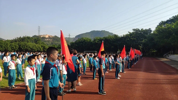 早晨,伴随着冉冉升起的太阳,全体师生在操场举行升国旗仪式,国旗在庄严的气氛中徐徐升起,在队员们的嘹亮的国歌声中飘扬。升旗仪式结束后,由四1中队进行主题为《队知识教育》的国旗下讲话,队员们在听的过程中重温队知识。接着学校大队长带领中队长进行出队旗仪式,全体少先队员行队礼,唱队歌。队歌结束后,学校少工委主任向全体队员传达了《习近平总书记致中国少年先锋队全国代表大会的贺信》精神,少先队代表给队员们讲了先锋故事,队员们听了雷锋和钟南山的故事后,受到很大的触动。接着大队辅导员就中国少年先锋队建队71周年进行讲话并带领全体队员呼号:准备着,为共产主义事业而奋斗,全体队员回答:时刻准备着。呼号结束后进行退旗仪式,全体队员敬礼。早上的活动由此结束。