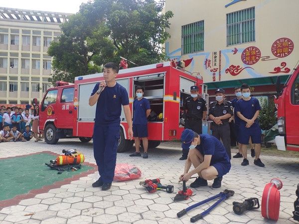 紧接着,南区消防中队的消防员在教学楼前的小广场上向师生介绍了一系列的消防装备,如氧气筒、消防防护服、液压剪、扩张器、绝缘剪、多功能水枪、灭火服、手动破拆工具组等。消防员还亲身示范这些装备的使用方法,部分学生代表学习了消防装备的使用方法,学生们在体验中增长了消防知识及技巧,强化了安全意识。