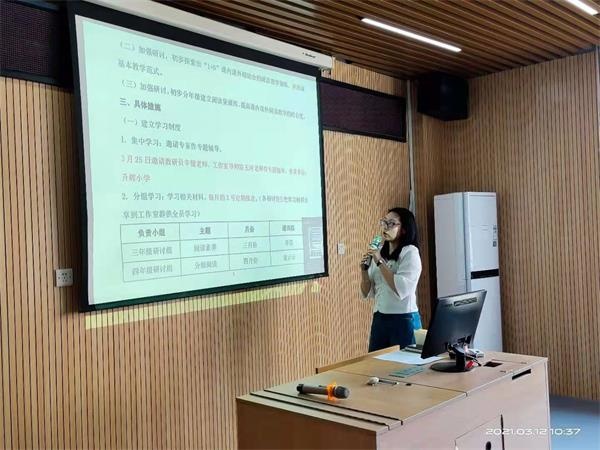 会议开始,主持人朱殷沂老师对本年度工作室的工作计划进行了详细的解读。朱老师针对本镇英语阅读教学的具体情况,对工作室的成员进行了具体详细的分工,初步探索“1+N”课内与课外相结合的阅读教学策略,提高课内与课外阅读教学的结合度,其中提到要建立年级研讨小组并且成立实验班,对学生情况进行摸底检测。