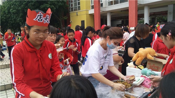 现做美食、扔圈套物、精品文具、零食礼包……同学们、家长义工的角色多变,售货员、收银员、推销员随处可见。各个摊位都使劲浑身解数,招揽一批又一批的小客户。一件件充满爱心的卖品,一张张纯真可爱的笑脸,一声声此起彼伏的吆喝,使整个操场一下子汇成了欢乐的海洋,给春意盎然的校园增添了更多生机和活力。“淘客”们穿梭在义卖校道上,开心地寻找自己心仪的宝贝,其中不乏老师们,为了支持爱心活动的开展,老师们也加入了“淘宝”大军。