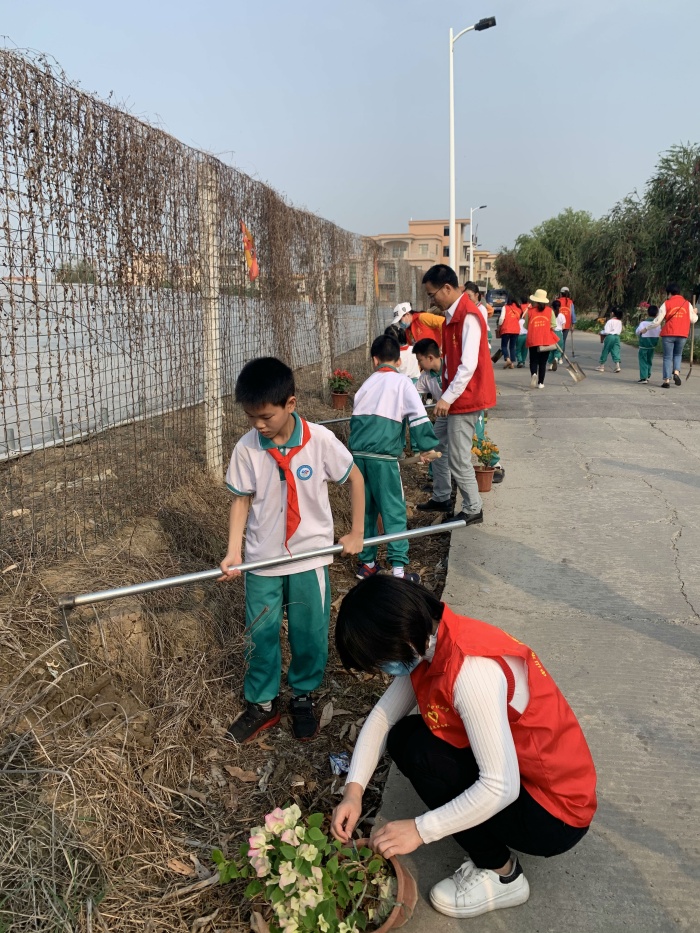 活动当天,在崔焕英校长的亲自带领下,亲子义工们有挖坑的,有扶着树苗的,有填土的,还有提着水桶来回浇水的,打支撑的,干得热火朝天。当中有不少孩子都是第一次参加植树,动作稍显笨拙,但丝毫不影响他们对植树节劳动的积极与热情。家长们手把手地指导,并提示孩子们注意安全。两个多小时过去,在全体亲子义工的努力下,栽种工作顺利完成,共栽植三角梅一百五十余株。轻柔的春风中,看着自己亲手种下的一棵棵小树,畅想着数年以后它们慢慢长大,枝繁叶茂,孩子们脸上露出了灿烂的笑容。