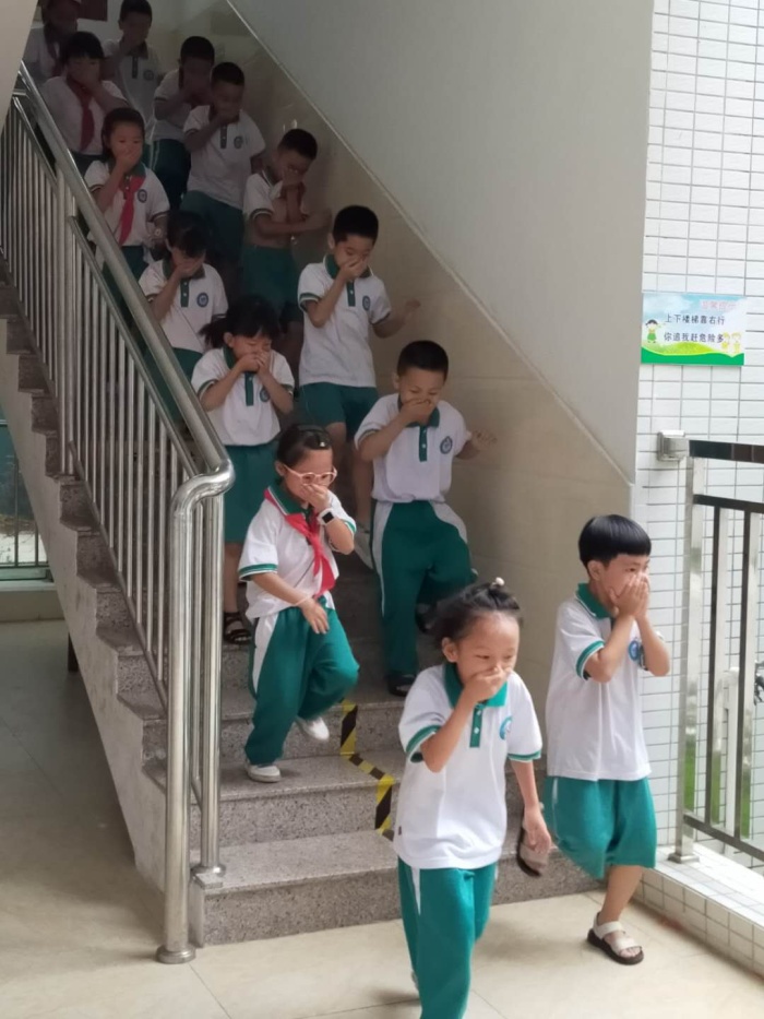 下午3:45,警报声拉响,演习正式开始。各位老师及时准确的到达指定位置,认真协助,确保活动安全顺利的举行。教室内的同学们迅速按照预案疏散线路逃生,大家用毛巾捂住口鼻、弯着腰,靠楼梯右侧,安全、紧张、有序地撤离到指定位置。