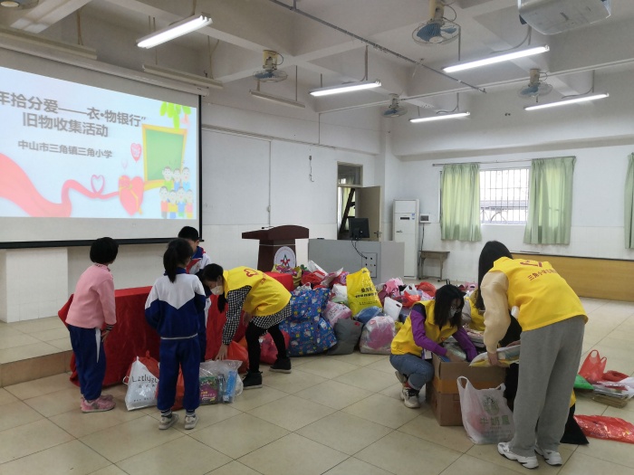 为积极响应中山市少工委倡议,弘扬爱心传播精神,提高垃圾分类、旧物化宝的环保意识、生态意识,引领广大青少年做力所能及的环保行动,1月6日下午,三角小学组织开展“青年拾分爱——衣?物银行”旧物收集活动,为困难人群送上温暖的问候。