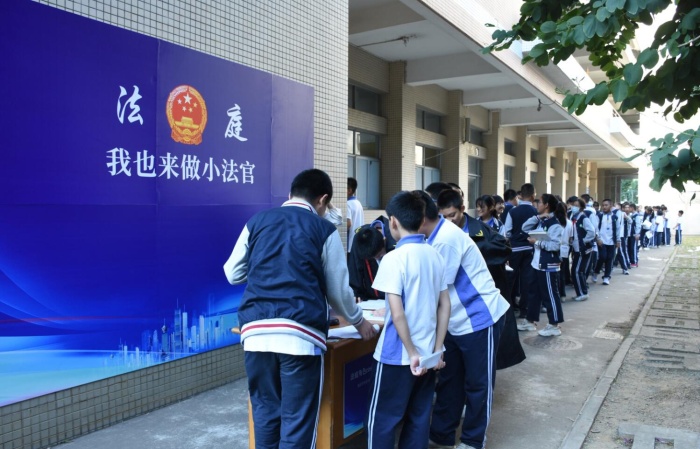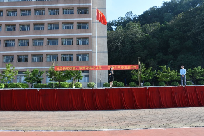 活动开始,首先是来自广东国融律师事务所的律师人员向同学们介绍关于民法典的知识。律师结合自己的从业经验,紧贴学生的生活实际,为同学们讲解和分析专业的法律知识和案例,她强调了《民法典》对于每位同学的重要意义,阐明了法治精神对于每位公民都是不可或缺的,让同学们对民法典有更清晰深刻的了解和认识。随后,普法小游戏开始,普法飞行棋,学法打卡拍照框,法律套圈,法治拼图,精心设计的小游戏,巧妙地把学法与游戏结合起来,趣味盎然,寓学于乐,同学们积极参与到游戏当中,在游戏中收获了挑战自我的欢乐,同时也学会了不少知识。活动的第三个环节是宣誓活动。同学们以班级为单位,排着整齐的队列,有序地来到国旗下,进行庄严的宣誓仪式。在宣誓仪式中,同学们面向国旗发出郑重的承诺,将不负民族的寄托,不负人民的期望,遵纪守法,为了中华民族的兴旺发达,做一名合格的守法小公民。