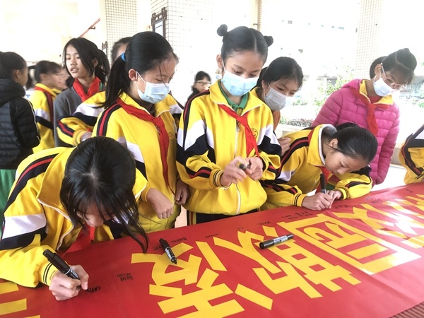 学生代表邓楚柔发言,带领全体学生作出承诺,拒绝校园欺凌,争做一名懂法守法、文明向上、积极奋进的新时代好学生。紧接着,在各班主任的组织下,学生们在“拒绝学生欺凌,争做遵纪守法的小公民”横幅上,郑重地签下自己的名字。最后,德育处黄洁玉副主任作总结发言,她号召全体高平学子做一个遵纪守法,文明友善的社会小公民,杜绝学生欺凌和暴力行为,共筑文明和谐校园。