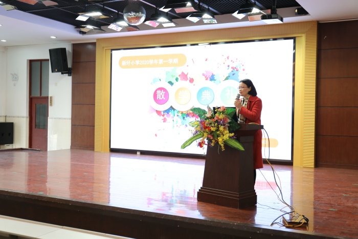 散学礼由练海燕主任主持,首先朱华春副校长借助图片与全体师生一起回顾了本学期在教学、德育、少先队等方面的精彩活动,一张张照片记录了本学年师生成长的印迹。朱校长表彰了期末考试中获得优异成绩的个人和集体。接下来则是教师代表胡晓华老师发表主题为“我的学习我做主”的讲话,分析了学习收获多少的原因在于学习态度、主动学习和自主努力这三个方面。学生代表五3班张文婷在讲话中分享了阅读竞赛的经验;要善于积累,把自己带进书中,阅读训练要记录自己的答题思路、规定答题时间和遵循先易后难的原则。读书是制胜法宝,秘诀在于多读多练。