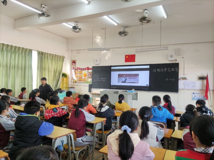 新圩小学驻校民警蓝金元警官对全体学生进行了法治、防诈骗知识教育,蓝警官在讲解的过程中,引用了真实、生动、实际的事例和视频进行了释法,起到了很好的教育效果。