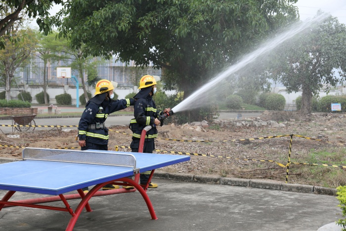 上午11:10,随着“呜呜……”应急警报声的响起,演练正式开始。各年段负责人及各楼梯口负责老师第一时间到岗,协助学生快速、有序的撤离;各班主任、任课教师指导学生弯腰慢跑、同时用手帕等捂住口鼻,跟着队伍迅速撤离到指定位置,整个过程师生都能做到有秩序而快速。随即,两辆消防车从校门驶入特定场地,迅速展开消防演习,向虚拟火灾场地喷水灭火。演习结束后,陈文丽主任对本次应急疏散演练中存在的细节问题进行小结。