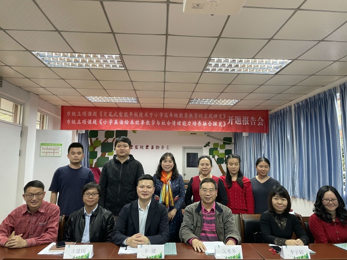 为扎实推进课题开展,不断激发教师的科研热情。2021年3月26日下午,三乡镇平岚小学举行了中山市教育科研2020年立项的课题《交互式智能平板技术于小学高年级数学教学的实践研究》和青年课题《小学英语绘本故事教学与社会情绪力培养融合探究》的开题报告会。活动邀请了市教体局教师发展中心、市中小学教师信息技术应用能力提升工程2.0办公室主任吴寒冬教授、市小学英语教研员辛键老师、五桂山学校李宇韬副校长、 三乡镇教育和体育指导中心王建国主任、 三乡镇小学英语中心教研组组长赵淑珍副主任。参会的还有刘杰校长、平岚小学数学科组、英语科组以及兄弟学校的老师们。