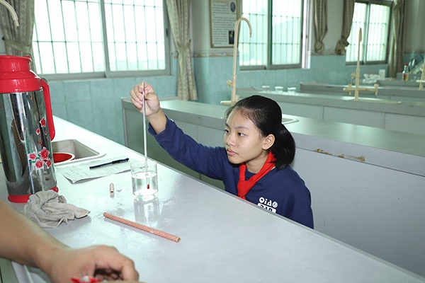 考核试题共有六道,分别是测量不规则石块的体积、测量液体的温度、电路的连接、区分水白酒白醋、声音的产生以及让气球膨胀起来。考前,六年级科学老师在科组长黄孔佳老师的带领下,对学生作了细致的辅导,让学生分组背诵熟悉实验操作,并通过反复实操练习提高学生的操作准确性以及熟练程度。