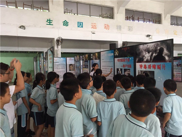 然后,学校组织各年级学生有序参观了禁毒“集智大迷宫”。天真无邪的孩子们好奇地看着毒品的分类介绍和样品,看着一个个因吸毒而面目全非的人,看着吸毒者因毒品而失去理性,导致家破人亡的景象图片,内心受到强烈的触动。活动现场还设有仿真毒品展示区域,禁毒社工向同学们讲解了毒品的危害,并派发禁毒宣传小册子,开展禁毒游戏、进行有奖问答。同学们看着毒品模型,近距离接触了人类社会的头号公敌 “毒品”,不时向在场的义工提问。义工们耐心地为同学们一一作答,并为他们详细介绍了禁毒知识,重点给他们讲解了毒品给个人、家庭及社会带来的严重危害。期间,有的同学边参观边做笔记,有的同学一边比划吸毒人员自断手臂的动作,一边讨论毒品的危害性。大家态度端正、认真听讲、仔细参观、心有所思,感到收获满满,对毒品的危害性有了更加深刻的认识。