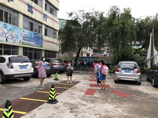 学校为孩子们返校复学做了各种精心的准备,每一个环节,每一个细节,都蕴藏着贴心的守护。走进校门,地面上张贴着清晰显著的标识线,老师们早已守候在校门两侧维持秩序,并为每一个通过的学生测试体温、消毒鞋底。孩子们排着整齐的队伍,保持间隔距离,有序地走进校园。