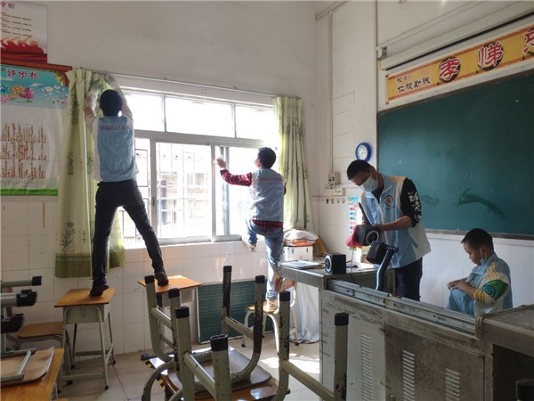沉寂了一个月的龙头环学校校园里,突然热闹起来了,每一间办公室和教室都有忙碌的身影,老师们、家长们、学生们纷纷开始了细心的清洁工作,对楼道内、楼梯间、学生教室、教师办公室等场所进行全面清洁消毒,并保持教室开窗通风,确保清洁不留死角、不漏盲区。做好防疫消毒工作,为迎接开学的到来做好准备。