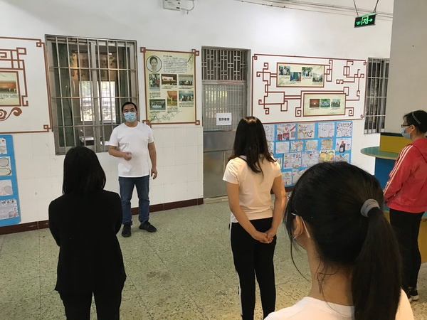 接下来,演练活动从“入校管理”这个情景正式展开。学生在校门口保持安全距离排队经过消毒双手后进入学校,再经过值日教师测量体温。演练中模拟有学生在体温检测时出现发烧,值日教师安排学生到隔离点等候,值日行政再次测量该生体温,了解询问该生的身体状况,并了解该生有无与疫情发生地的人员有密切联系,有无到过疫情高发地区,有无接触过疫情发生地的外国人员,结果属于普通感冒发热,班主任联系家长带学生前往医院发热门诊就医,要求康复后才能回校上课。接着演练了“上课期间学生突发身体不舒服”的情景,展示了学生在课室上课时发病、护送到隔离室、安抚余下学生等过程。第三个部分是值日行政在隔离点询问、观察身体不适学生,模拟如何处理有疑似病例的学生的全过程。最后演练了各层次负责人汇报情况、学校疫情防控工作小组启动应急预案等场景。