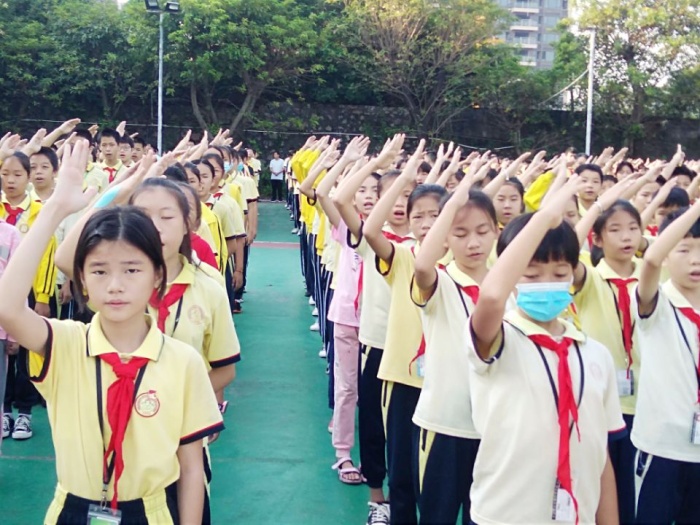 同时,为了庆祝中国少年先锋队建队71周年,2020年的10月13日上午,华强学校七年级少先大队举行了建队仪式。七年级的少先队员们在嘹亮的队歌声中,在校领导和辅导员老师们的关怀和见证之下,成立起自己的组织,校团委书记王丽清宣读了辅导员聘任决定和各中队中队长名单,并颁发了新任辅导员聘书。