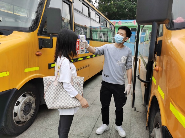 第四个场景是乘坐校车。校车到点,教师下车,先对学生测体温,测温正常后上车。如果体温异常,跟车老师马上跟家长联系,要求接回孩子,赴医院就诊,老师陪伴等待家长到来,然后老师向主管行政报告,再由主管行政继续跟进。
