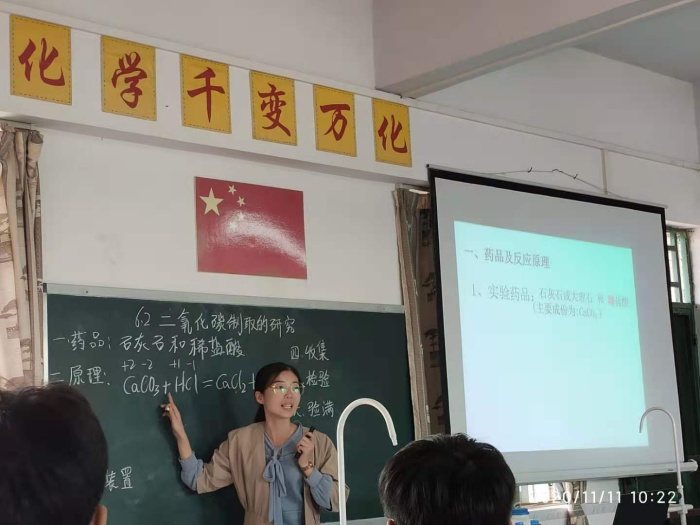 本次赛课的内容为九年级化学上册的《二氧化碳制取的研究》,每一位参赛的老师都认真研读教材,科学合理地设计教学环节,通过对氧气实验室制取,引导学生了解实验室制取气体装置的设计思路,让学生对提供的仪器进行选择组装一套制取二氧化碳的装置,再分组交流讨论,比较各自装置的优缺点,从中确定一套最佳装置制取二氧化碳,学生利用稀盐酸与大理石反应来制取二氧化碳(CaCO3+2HCl=CaCl2+H2O+CO2↑)。在教学中,老师们注重让学生自己观察、自己发现、自己概括,充分调动学生自主学习的积极性,从而较好地突破了实验室制取二氧化碳反应发生装置的这一教学难点,学生在活动中产生了深刻体验,从而牢固地建构了判断气体发生装置的方法。课堂上教师充分发挥学生的主体作用,鼓励学生勇于创新,大胆实践。参赛教师引导学生主动探究、亲历探究过程,体验化学的学习乐趣,让学生获得多方面的满足和发展,使他们感受化学的学习乐趣,让学生获得多方面的发展,真正使课堂教学焕发出生命的活力。