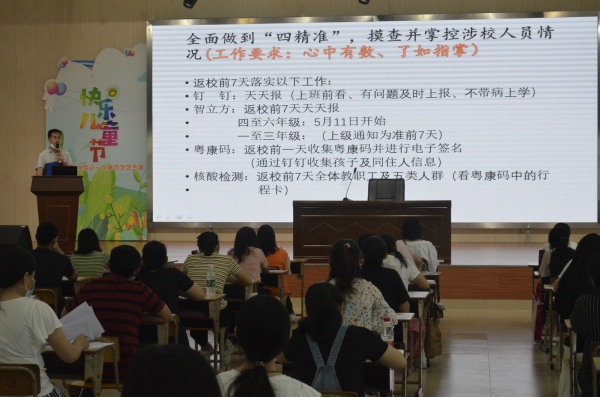 5月8日,学校召开《关于做好疫情防控及学生返校准备工作》教师大会,孙校长动员全体教师要认真做好学生返校准备各项工作。她表示,省、市各级党政部门高度重视、联防联控并做好了总体的部署,学校全体教职工一定要认真落实,将返校工作做得更实更细。学校全面关爱教师身心健康,指导教师关注、落实心理建设。孙校长在会上再次向老师们强调,要认真学习5月6日下午学校心理专职教师在《教师心理健康及自我调适》培训中提及到的《中山市中小学疫情防控下返校心理建设指引》等心理健康教育文件,做好教师、学生、家长三方面的心理调适,用平和的心态迎接返校复学。