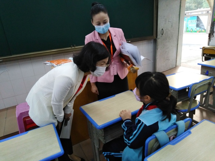 温委员入校前主动配合保安测试体温。询问门口人脸识别闸机和寒假初广东鑫光智能系统有限公司赠送学校测温一体柜的使用情况。关切询问学校防疫物资的准备和开学第一天师生的返校情况,还有目前班级人数,并到教室实地查看是否宽敞,能否让学生坐得舒服。不时亲切地弯腰或蹲下询问学生的返校心情,假期有没有完成老师布置的作业等,言语间充满关爱。在党和政府的关怀下,联一小学的全体师生倍感幸福。