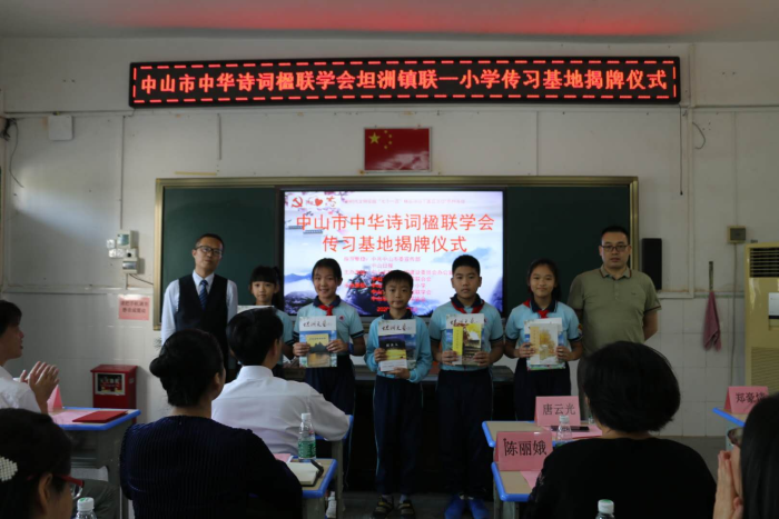 中山市中华诗词楹联学会主席高松先生、坦洲镇文学协会会长方伟华先生、坦洲镇文学协会副会长唐云光先生、郑豪情先生、王宏先生和联一小学全体行政及语文教师参加此次活动。