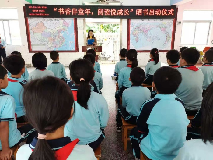 首先进行的是晒书启动仪式。由教师代表肖颖老师发出“捐两本,读百本”晒书活动倡议;学生代表六(1)班的古圣堡同学向同学们介绍多读书的益处;马校长在致辞中提出一个希望:希望从现在开始,同学们能全身心地投入到读书活动中,让知识伴随同学们走好人生的每一步。该校一直以来,十分注重培养学生的阅读习惯,过去一学年,学校为各图书角增添一万多元的图书,还增设了一个 “队长书吧”,让同学们在放学等候父母接送的时候,自主阅读。