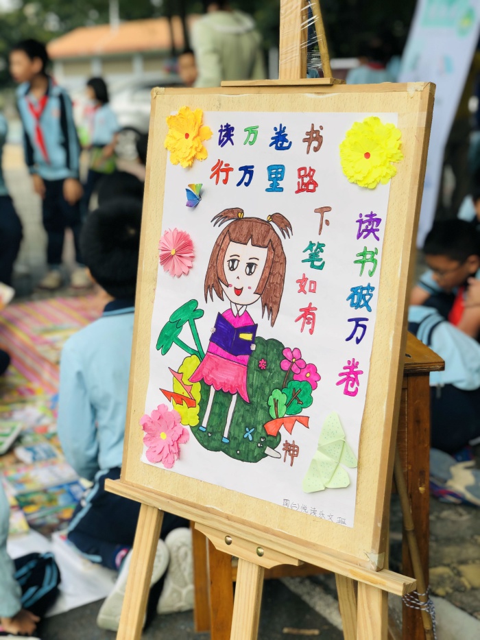 启动仪式结束后,晒书活动正式开启,全体师生以及班级家委的一齐参与让整个校园沸腾起来。全校14个班级可谓八仙过海各显神通,无论是晒书摊位的布置还是同学们以书换书的创意,都让人大开眼界:三(3)班的 “瓶水斋”夺人眼球;四(1)班的 “淘书乐”精美别致,让人耳目一新;四(3)班“会移动”的海报,真让人拍手叫绝;五年级同学制作的各类精美海报,让人啧啧赞叹……还有各种换书抽奖,换书赠书签等植入的小活动,把晒书活动推向了高潮,整个校园洋溢着欢声笑语。一个小时的晒书活动接近尾声,喧嚣过后,整个校园又是一幅别样的宁静:换得心爱之书的孩子们不约而同,在校园的各个角落,席地而坐,手捧书籍,静静阅读,阅读的美好在这里悄然而生。