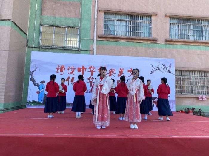 本次活动以诵读、舞蹈、吟唱等艺术表演形式开展,赛前老师们和同学们为本次活动精心编排,认真训练。整场比赛,学生们的表现精彩纷呈,各具特色:有的慷慨激昂、铿锵有力,有的温柔婉约、柔情似水。五、六年级学生演绎的开场节目——《少年中国说》,学生诵读得琅琅上口,悦耳至极,为正式表演的开始拉开序幕。一(1)班的学生带来的节目——《唐诗新唱》,学生们在低吟浅唱中、抑扬顿挫中诠释了中国古典诗词的独特韵味。五(1)班学生带来的歌伴舞节目——《水调歌头.明月几时有》,优美的舞姿,婉转动听的歌声深深印入师生们、家长们的脑海。表演中,学生们古诗诵读字正腔圆、有板有眼,优美的经典诗文,精彩的诵读表演,让全校师生的心灵受到了国学经典的熏陶和感染,受到传统文化的洗礼,同时也彰显了中国经典诗文的魅力。