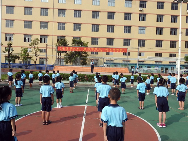 8:30分,同学们排着整齐的队伍来到操场,参加学校开学典礼。结合今年创文活动,今学期开学典礼的主题是“学文明礼仪,做文明学生,创文明校园”。开学典礼首先由学校小主持人带领全校同学齐念社会主义核心价值观,并向全校师生宣读创文倡议书。接着,六(1)班的学生代表文欣蕊做新学期国旗下讲话。她先介绍自己如何过一个有意义的暑假,然后代表全校同学向学校承诺要做一名爱我,爱家,爱校,爱国的四爱好学子。