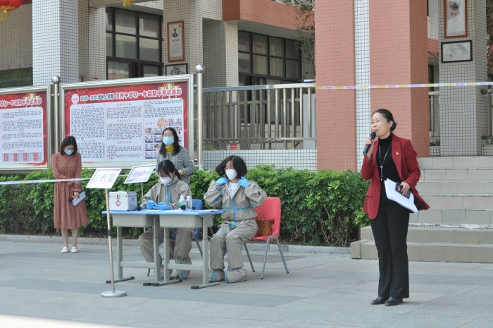 本次演练分三个阶段,第一阶段:及时报告,立即隔离,学校启动疫情防控应急预案。学校发现一名从高风险地区返回学生,经集中隔离和居家隔离未出现不适症状随即返校,但在返校2天后核酸检测初筛阳性。吴剑文校长接到疾控中心通知后,立即报告坦洲镇教育体育事务中心,并通知校医做好相关应急措施,同时召开应急处置分工会议,立即启动突发公共卫生事件应急预案。