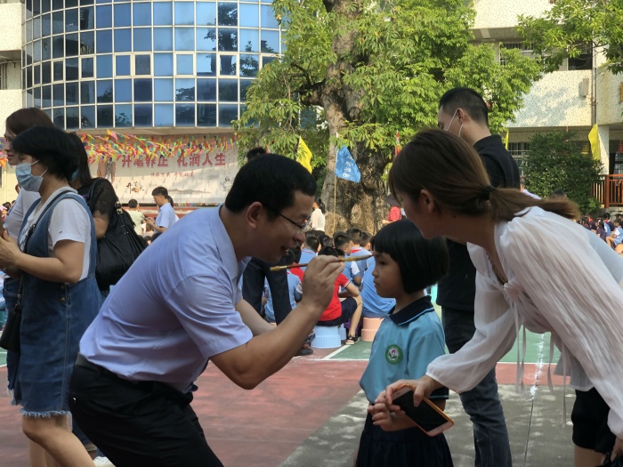 为了弘扬中国传统文化,给一年级新同学一个有意义的开学典礼,更快的融入小学的学习生活,全体师生召开了开学典礼。首先,余壁峰校长与一年级班主任老师热情洋溢地为新生用红色的朱砂在孩子们的额头正中点上红痣。“痣”通“智”,意为开启智慧,以此寄托美好的愿望,从此眼明心亮。启智引入大门后,每一个孩子还获赠了《弟子规》,并由六年级的大哥哥大姐姐手拉手踏上红地毯走进会场。入学典礼上升国旗唱国歌,诵读《弟子规》,展现出学生良好的精神面貌。接着人潮教育罗锦添校长和孩子们“一撇、一捺、置笔、收墨”在庄重的仪式中写下厚重的“人”字。罗校长还一边示范一边介绍,人字有两笔构成,一撇一捺,星空体育要团结互助,互相帮助,孝敬长辈,乐于学习,知书达理,富有爱心,知错能改,不断进步,热爱祖国,顶天立地,写完要做一个堂堂正正的人。之后“拜师礼”在大队辅导员朱文娟老师对“恩师”这个词语庄重的解读中,孩子们三鞠躬拜谢即将陪伴他们的恩师,孩子们三鞠躬拜谢养育自己的父母。最后,由余校长代表学校向全体师生传达了新学期祝福,同时向同学们提出新学期的希望:希望同学们养成好习惯,做一个懂礼貌,讲文明,有道德的小学生。