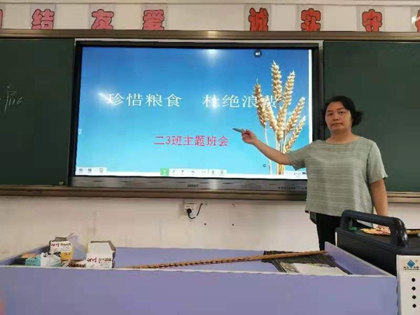 在各班主任的精心准备下,各班级围绕主题教育内容,就我国人口增加、耕地减少、水资源短缺、粮食安全压力大等现状,通过大量的图片及数据,帮助学生树立起节约光荣,浪费可耻的意识。告诫同学们要珍惜每一粒粮食,无论是在校内校外,或是外出就餐,都应该不挑食,不剩菜剩饭,杜绝“舌尖上的浪费”。同时,倡导学生积极监督身边的亲人和朋友,及时制止浪费粮食的现象,并督促家人、朋友,时时讲节约、处处不浪费。