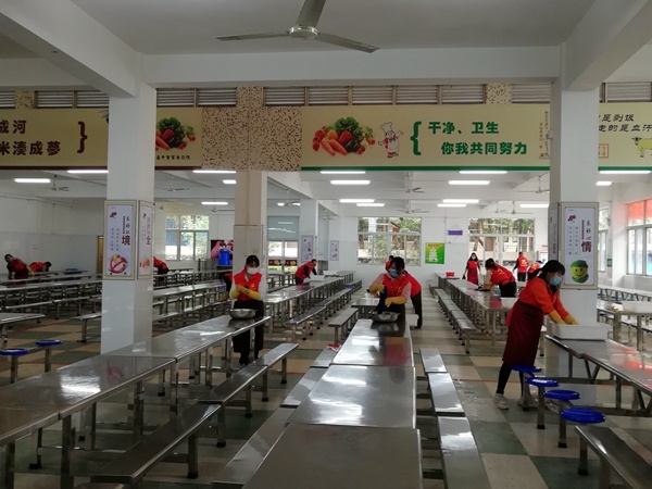 全体后勤人员行动起来。学校后勤人员清洗饮水设施设备,检查维修水电设施设备,想方设法准备开学的各项防疫物资储备,宿舍的清洁、消毒,宿生的床位安排,洗手盆的增加,事无巨细,周密安排。全体外包服务公司也行动起来。校园环境的美化、清洁与消毒,饭堂的清洁、消毒,座位的安排,标识的优化。所有一切都是为了让师生回校后有一个明确的指引,确保师生的健康与安全。