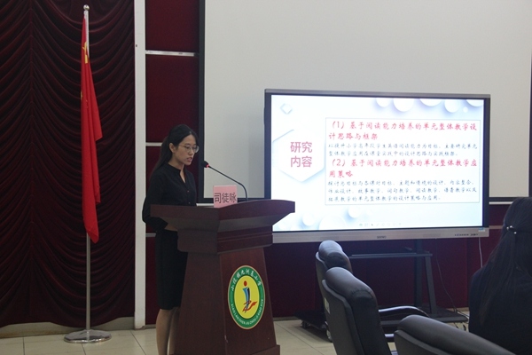第三议程是课题中期汇报。由课题主持人司徒咏老师代表课题组成员在二楼教师会议室作课题研究中期汇报。司徒咏老师的发言自信大方、铿锵有力,主要从研究背景、目标、内容、思路、方法、课题创新之处、中期成果等方面向与会专家、领导和老师们作了详尽的汇报。在汇报中,她指出本课题研究始终把激发学生英语阅读兴趣,提升学生英语阅读能力和英语思维能力放在重要位置,努力打造有特色的单元整体视角下的阅读教学。同时,她也提出了她对此课题研究的疑难困惑和后期展望。