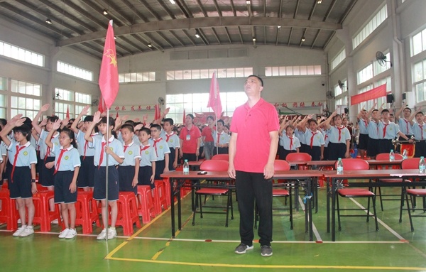 全体新入队的同学在大队长岑金燕同学的带领下,在庄严的队旗下,高高地举起右手大声宣誓。那响亮的声音在体育馆回荡,小队员们一定不会辜负家长和老师的期望,在星星火炬的指引下,牢记党的教诲,全面发展,茁壮成长。