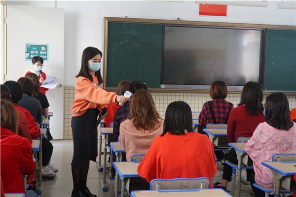 上午11时20分,在学校疫情防控工作领导小组的指导下进行了演练;洪智跃主任一声令下,演练开始了。在学校门口进行了进校晨检演练,安保人员及值日教师按开学后的工作要求上岗,教职工佩戴口罩从正门进入校园,人与人之间保持一米距离,依次完成测温、手部消毒;筛查出发热或疑似发热人员,及时进行妥善处理。