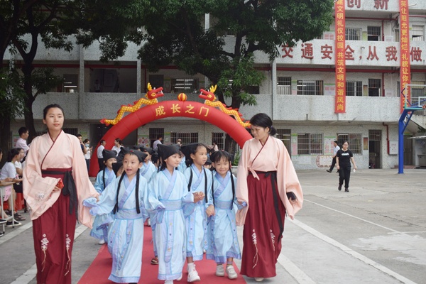本次“开笔礼”仪式包括:正衣冠、礼拜先师、敬谢父母、敬拜师长、朱砂启智、书字明理、击鼓鸣志、经典立志等多个环节。