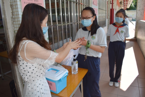 模拟学生放学时,实行错时放学制度,放学时间提前告知家长,学生保持排队间距,有序放学。乘坐校车的学生排好队伍、保持1米间距,有序等待跟车老师测量体温、洗手后方可上车入座。学生离校后,班主任老师将教室清扫通风,对教室进行全面消毒。