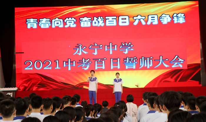 此时此刻,队列前面的老师们为学生挥手鼓劲,队列后面的师弟师妹为学长们呐喊助威。那掷地有声的誓言,那铿锵有力的呐喊,在体育馆上空久久回荡,历久不散。不但彰显着他们的愈战愈勇的豪情壮志,也昭示着今年中考,永中再创辉煌!向中国共产党建党100周年献礼!