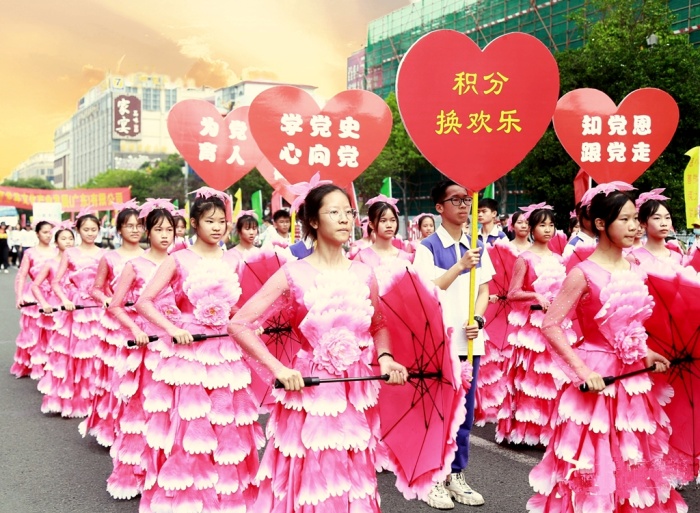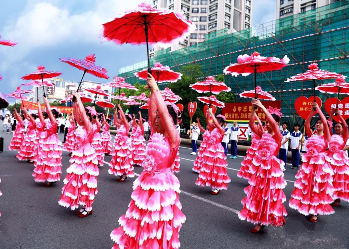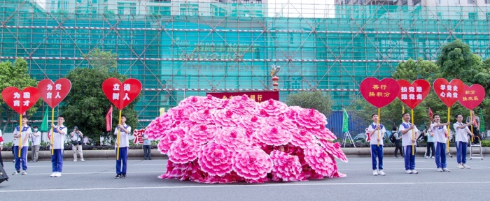 永宁中学“红心向党”花开盛世花伞巡游队是一支特别引起观众关注的创新巡行方队。他们舞动手中的花伞,举着“善行换积分、积分换快乐、学党史、心向党、知党恩、跟党走、为党育人、为国育才、立德树人”等彩旗和标语,高喊着“阳光自信、励志勤学、博爱善良”的口号,引来了沿途观众的阵阵掌声和喝彩。最引人注目的是答谢台前,同学们化着彩妆、手持花伞、翩翩起舞、舞蹈造型盛世花开。同学们仪态大方、着装典雅、亮丽清新,舞蹈既展示了优美的中华古典文化,又体现了永中人大爱涌动的情怀,既弘扬了中华博爱精神又融入了永中公益元素,赢得了现场领导、嘉宾观众的阵阵掌声。他们撒播了一个个爱心、收获一次次感动,充分彰显出永中人的大爱情怀和澎湃激情。