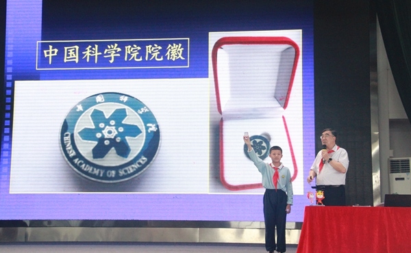 徐教授一进会场,全场爆起雷鸣般的掌声,学生代表上台给徐教授戴上红领巾,并送上校庆纪念品——校娃,代表学校对徐教授的到来表示热烈的欢迎。