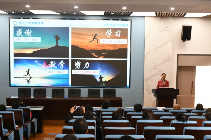 喻的的老师分享的主题《发挥‘三牛’精神,争创中考优异成绩》。喻老师提到作为一名老师要不断地学习,自我改变、自我成长,活到老,学到老,人要像竹子,不断突破自己;在教学方面要用实干笃定前行,帮助学生打牢基础知识,努力拓展学生的知识面;面对中考将准备好两颗心:决心和信心,将发扬“三牛”精神,以牛劲牛力创造中考优异成绩!