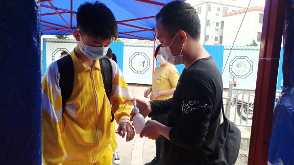 4月27日上午,聚星学校门口早已站着等待孩子们返校的班主任、老师。在聚星学校正门,孩子们根据老师的要求,有序地排成了间隔一米的队形,经过红外线测试仪体温测试、消毒后进入校园。进入校园后,孩子们也不扎堆自觉单行、有条不紊按照要求排队交健康卡、测量体温、消毒、到洗手池洗手消毒,排队上楼进入班级。为了学生进入校园时不产生扎堆的现象,聚星学校实行错峰上学,让同学们错开班级、时间进入校园。
