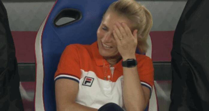 而在比赛中,面对如此轻松的一场大胜,荷兰女足主帅在场边不禁偷笑。