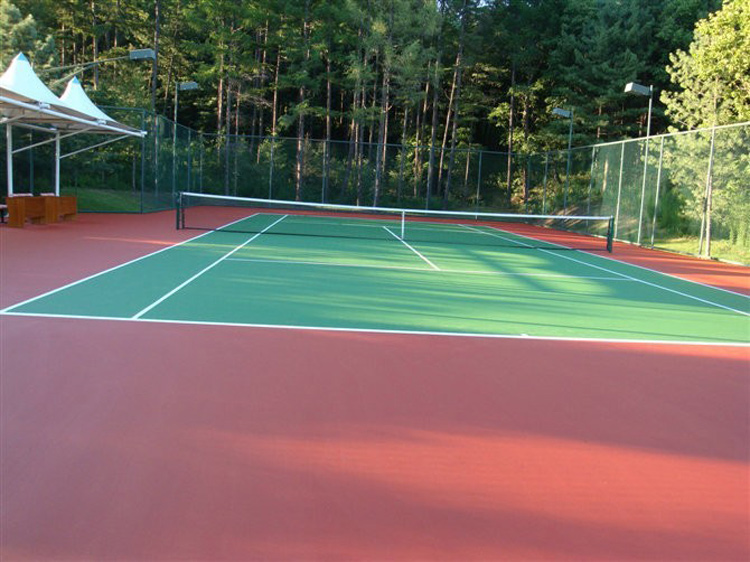 材料简介:丙烯酸树脂球场(弹性丙烯酸网球场,硬地丙烯酸网球场)适用于专业选手比赛和训练使用,由100%纯丙烯酸乳液加入进口色料及助剂制成,完全符合环保要求,具有较好的耐磨性能,防水、防晒、防滑、可铺设于室内外沥青或水泥面上。可依照加砂及水的配比调整表面糙度。中级性能产品。